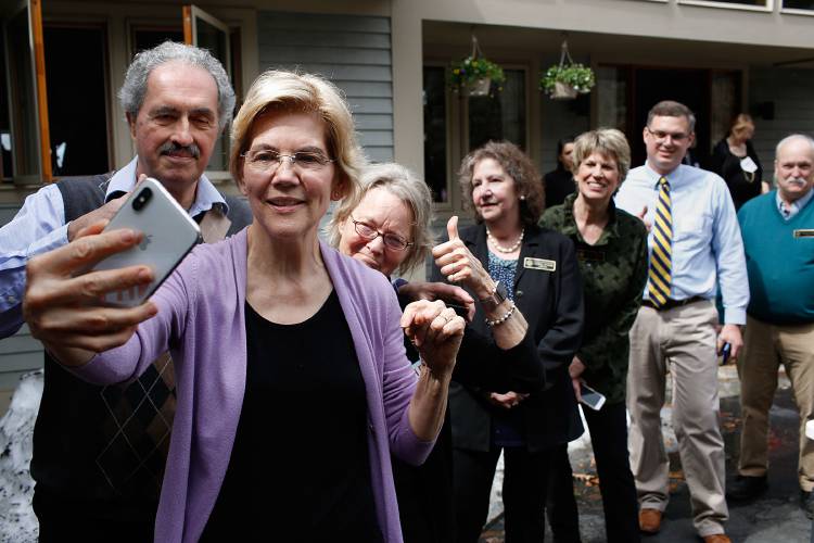 Presidential candidate and U.S. Sen. Elizabeth Warren, D-Mass., makes a selfie video for Twitter after a house party hosted by Bruce and Ann Garland, standing behind Warren, at their home in Lebanon, N.H., on April 13, 2019. Warren spoke to 90 people at the Garlands’ home. (Valley News – Geoff Hansen) Copyright Valley News. May not be reprinted or used online without permission. Send requests to permission@vnews.com.